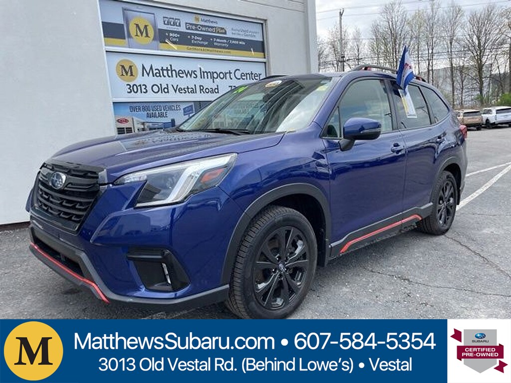 Certified. Sapphire Blue Pearl 2024 Subaru Forester Sport AWD Lineartronic CVT 2.5L 4-Cylinder DOHC 16V26/33 City/Highway MPGSubaru Certified Pre-Owned Details: * SiriusXM 3-Month trial subscription $500 Owner Loyalty coupon & 1 year trial subscription to STARLINK * Vehicle History * Warranty Deductible: $0 * Powertrain Limited Warranty: 84 Month/100000 Mile (whichever comes first) from original in-service date * Roadside Assistance * 152 Point Inspection * Transferable WarrantyMatthews Import Center promises each customer a thorough and confident 120-point inspection on our used inventory guaranteeing a relaxing and peace-of-mind experience. We are located behind Lowes in Vestal NY. Or call us at (607) 729 - 6261 Matthews Import Center 3013 Old Vestal Road Vestal NY 13850.Odometer is 13033 miles below market average!
