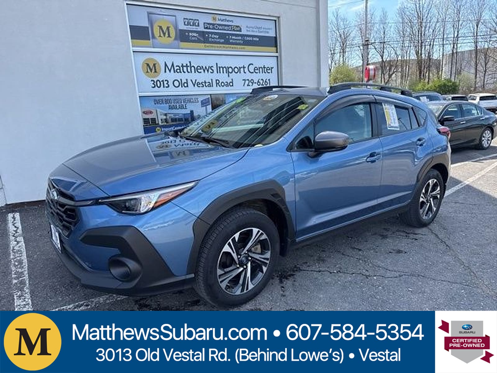 Mileage: 39,827 miles miles, MPG Range: 27/34 mpg, Engine: 2.0L i-4, Transmission: Automatic, Drive Line: AWD, Exterior Color: Horizon Blue, Interior Color: Black,Stock #: S26060A, VIN: JF2GUADC9RH294821, Comments: Certified. Horizon Blue Pearl 2024 Subaru Crosstrek Premium AWD Lineartronic CVT 2.0L 4-Cylinder DOHC 16V27/34 City/Highway MPGSubaru Certified Pre-Owned Details: * Powertrain Limited Warranty: 84 Month/100000 Mile (whichever comes first) from original in-service date * 152 Point Inspection * Roadside Assistance * Transferable Warranty * Vehicle History * Warranty Deductible: $0 * SiriusXM 3-Month trial subscription $500 Owner Loyalty coupon & 1 year trial subscription to STARLINKMatthews Import Center promises each customer a thorough and confident 120-point inspection on our used inventory guaranteeing a relaxing and peace-of-mind experience. We are located behind Lowes in Vestal NY. Or call us at (607) 729 - 6261 Matthews Import Center 3013 Old Vestal Road Vestal NY 13850.