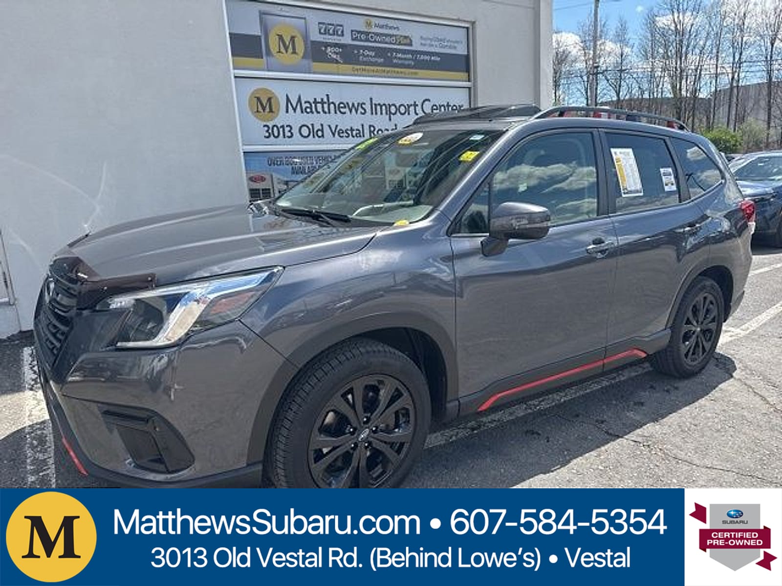 Mileage: 37,788 miles miles, MPG Range: 26/33 mpg, Engine: 2.5L i-4, Transmission: Automatic, Drive Line: AWD, Exterior Color: Magnetite Gray, Interior Color: Gray,Stock #: S26139A, VIN: JF2SKAJC4NH447457, Comments: Certified. Magnetite Gray Metallic 2022 Subaru Forester Sport AWD Lineartronic CVT 2.5L 4-Cylinder DOHC 16V26/33 City/Highway MPGSubaru Certified Pre-Owned Details: * Powertrain Limited Warranty: 84 Month/100000 Mile (whichever comes first) from original in-service date * Warranty Deductible: $0 * Vehicle History * Transferable Warranty * SiriusXM 3-Month trial subscription $500 Owner Loyalty coupon & 1 year trial subscription to STARLINK * Roadside Assistance * 152 Point InspectionMatthews Import Center promises each customer a thorough and confident 120-point inspection on our used inventory guaranteeing a relaxing and peace-of-mind experience. We are located behind Lowes in Vestal NY. Or call us at (607) 729 - 6261 Matthews Import Center 3013 Old Vestal Road Vestal NY 13850.Odometer is 23742 miles below market average!